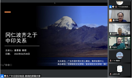 2022年6月28日晚,由人事处和教师发展中心主办、伟德bv国际体育、亚非学院(筹)承办的“著名教授论坛第563讲”在腾讯会议线上平台举行。清华大学外文系、国际与地区研究院教授、博士生导师,教育部高校外指委副主任委员、非通用语分指委主任委员姜景奎教授应邀为我校师生带来了题为“冈仁波齐之于中印关系”的精彩讲座。该次讲座由伟德bv国际体育、亚非学院(筹)副院长胡瑞副教授主持,校内外教师、学生150多人参加了该讲座。