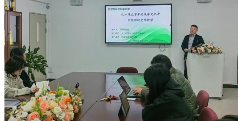 2024年12月26日上午,教学发展论坛第39讲在白云山校区第一教学楼北333室精彩开讲。本次讲座由人力资源部(教师发展中心)主办,日语语言文化学院承办,主讲人是伟德bv国际体育丁跃斌教授,主题为“从冲绳文学中的混杂文化看中日比较文学教学”,讲座由邓宇阳博士主持。