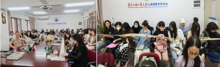 讲座过程中,丁莉教授还展示了古代日本绘卷复制卷轴,以直观形式展现绘卷艺术魅力,使师生得以近距离领略其艺术特色。最后,丁教授对在场师生的疑问做了详细的解答。
