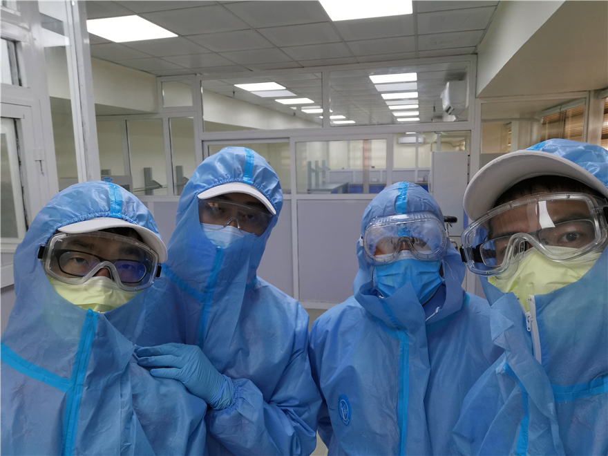 艾河旭(左一)和专家团成员在改造好的核酸检测实验室前