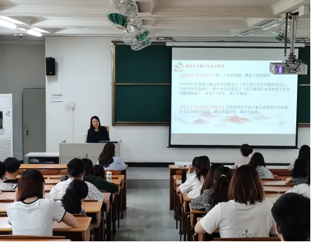 周秀娇首先向同学们介绍了党的十九届六中全会召开的背景和重大意义,指出全会通过的《中共中央关于党的百年奋斗重大成就和历史经验的决议》(以下简称《决议》),全面总结了党的百年奋斗重大成就和历史经验,是以史为鉴、开创未来,实现中华民族伟大复兴的行动指南,对推动全党进一步统一思想、统一意志、统一行动,团结带领全国各族人民夺取新时代中国特色社会主义新的伟大胜利,具有重大现实意义和深远历史意义。她从中国共产党百年奋斗史、中国共产党百年奋斗的五大历史意义、中国共产党百年奋斗的历史经验以及新时代的中国共产党四个部分详述了《决议》的主要内容,其中包括四大历史时期、“两个确立”的决定性意义、“十个明确”的进一步概括、“十三个坚持”的分领域总结等,对《决议》内容进行了系统宣讲和深入解读。