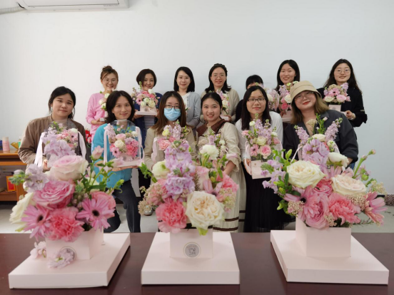 随后,各位老师按照花艺师的指引,把一朵朵鲜花按照自己的喜好进行穿插,打造独属于自己的花艺作品。花艺课结束后,每位老师都收获了自己亲手制作的花篮,朵朵鲜花,绽放春天之美。