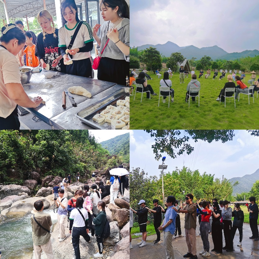 在古田村树田森林营地工作人员的引领下,师生们领略了广州市第二高峰“鸡枕山”的自然风光、广州流溪河发源地的冰河古道风光以及古田村的人文风情。在群山环绕的大自然中,师生们除了一起下厨包饺子,还开展了各类趣味横生的游戏活动,例如扔沙包、接飞碟、蒙眼绕路障、听令抢座位、中外歌曲联唱等。