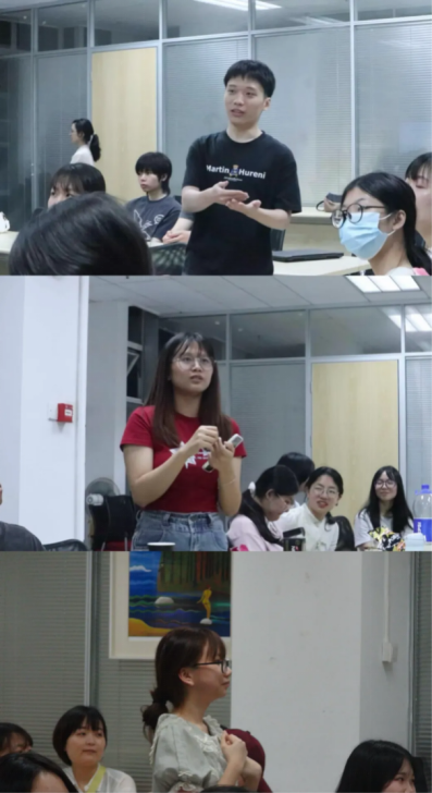 接下来是活动自由交流部分。学生们针对学习问题、兴趣爱好等方面,进行了热烈的讨论。前田哲也老师也莅临现场,向同学们分享了几个地道日常的日本语表达,如“戳中笑点”“全能人才”等。他的分享令学生们受益良深。