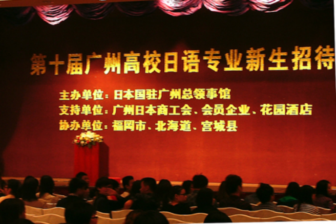 本网讯 10月29 日下午,由日本国驻广州总领事馆主办、广州日本商工会及其会员企业等赞助的第十届广州高校日语专业新生招待会于花园酒店首层国际会议中心举行。在教师李惠清和费俊慧的带领下,我校东语学院日语专业11级新生与来自中山大学、暨南大学、华南师范大学、华南理工大学等各高校的日语系学子共同参与此次盛会。