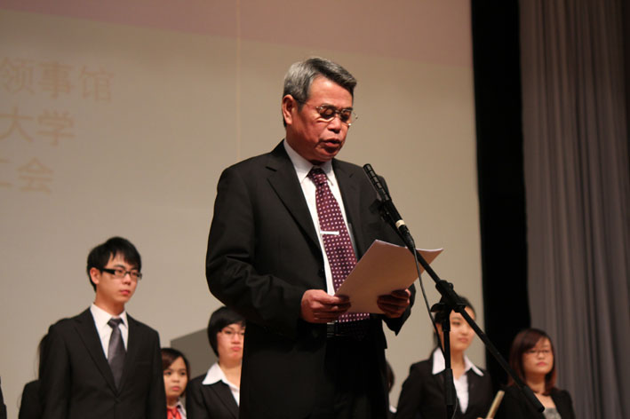 校党委副书记许国彬首先为演讲比赛致辞,他表示,广州地区非常重视对日语专业的发展,一年一届的大学生演讲比赛已成为广州地区日语教育界的一大盛会,也成为了中日交流的桥梁之一。他希望以本次比赛为契机,选手们能更好地检验自身的学习效果和提高自身的语言自由应用的能力。日本国驻广州领事馆总领事田尻和宏在发言中感谢选手们为本次比赛作出的努力,并且寄予期望,希望本次比赛中选手们都能有出色的表现。广州日本商工会副会长加藤修则鼓励新生们向师兄姐们学习,为中日两国交流合作做出贡献。
