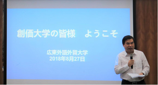 接着我校学生代表与创价大学学生代表分别发表致辞。我校学生代表在致辞中为从日本远道而来的日本同学们介绍了广外的环境,以及多姿多彩的校园文化生活,表示了对日本创价大学友好交流的意向,希望能共同学习,共同进步。来自创价大学的学生代表讲到能够来访我校心情非常激动,同时希望这样的交流活动能够为两校的同学带来积极的影响。