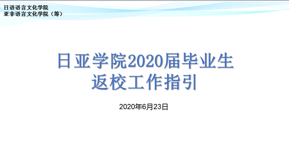 日语语言文化学院、亚非语言文化学院(筹)于2020年6月23日晚间举办了2020届毕业生返校工作指引会议。会议参与人员为2020届学院全体毕业生,会议主持人为辅导员许楚欣。会议内容包括返校对象的确认、返校条件的说明、返校时间的确定以及返校流程的指引共四部分。会议上细致讲解了学生返校流程,解答了同学们的疑问,取得了较好的返校指引效果。