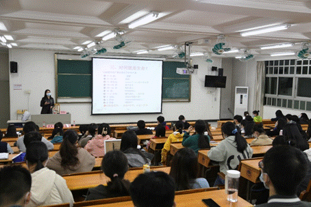 随后,洪锦兰医生向各位宿舍长介绍了应急救护、传染病分类概述及校园常见传染病的防控三个方面的知识。她强调,在当前新冠疫情形势持续严峻的背景下,做好校园疫情防控工作,建立健全学校、院系、班级、宿舍“四级”预警防控体系十分必要。她向各宿舍长介绍了针对心脏骤停急救的“黄金四分钟”和“生存链”的概念,艾滋病、登革热及诺如病毒等常见流行病的防治与消杀方法等相关内容。最后,她希望在座同学能够在课后利用互联网等更加深入地了解各类急救及传染病预防知识,适时对寝室进行消杀,做好个人卫生及防护工作。
