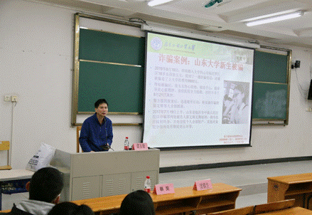 校保卫处谭玉锋老师向现场各宿舍长介绍了如何预防诈骗及如何做到消防安全的相关知识。他向宿舍长们展示了若干发生在校内外的典型诈骗案例并提醒在座同学,在新型电信诈骗手段防不胜防的当下,要提高自身警觉,以防各类潜在骗局。此外,他向同学们介绍了火灾预防及遭遇险情时的各类逃生方法,强调切忌在寝室使用各类大功率电器,做到“防患于未然”,杜绝悲剧发生;当遇到火灾等突发事故时,要在第一时间按照正确方法有序逃生,以免造成更为严重的人身伤害。
