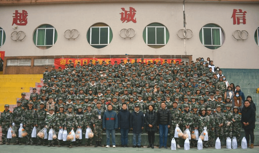 本网讯 1月11日下午,日语语言文化学院、亚非语言文化学院(筹)院长陈多友,党委书记周秀娇、副院长张秀强、张志刚,党委副书记曾智鹏,辅导员朱浩文、胡晓萱、蔡昊以及2019级朋辈导师代表和团学干部一行来到2020级本科生军训训练场慰问伟德bv国际体育全体在训新生。