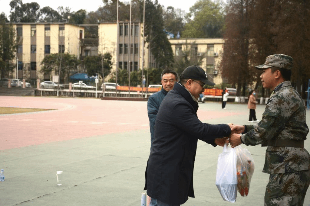 学院院长陈多友向教官发放慰问品