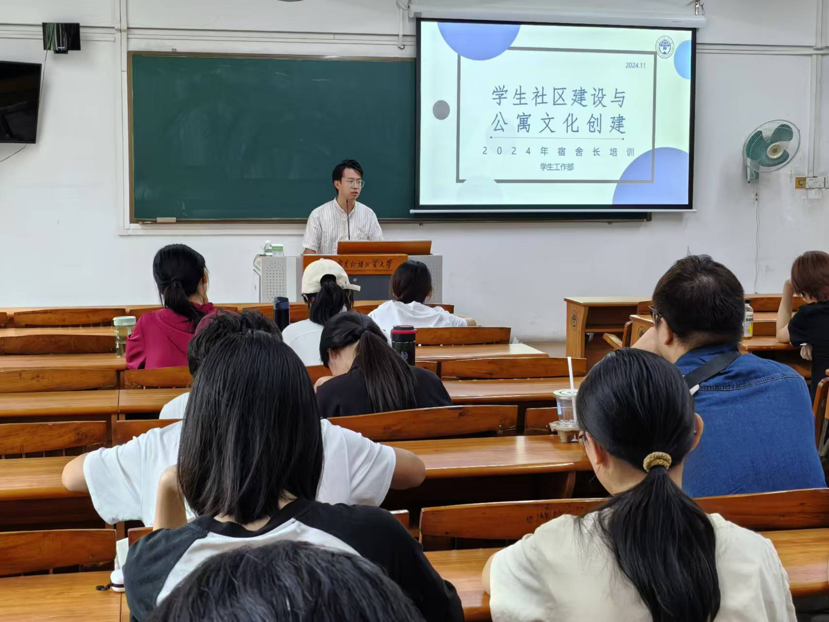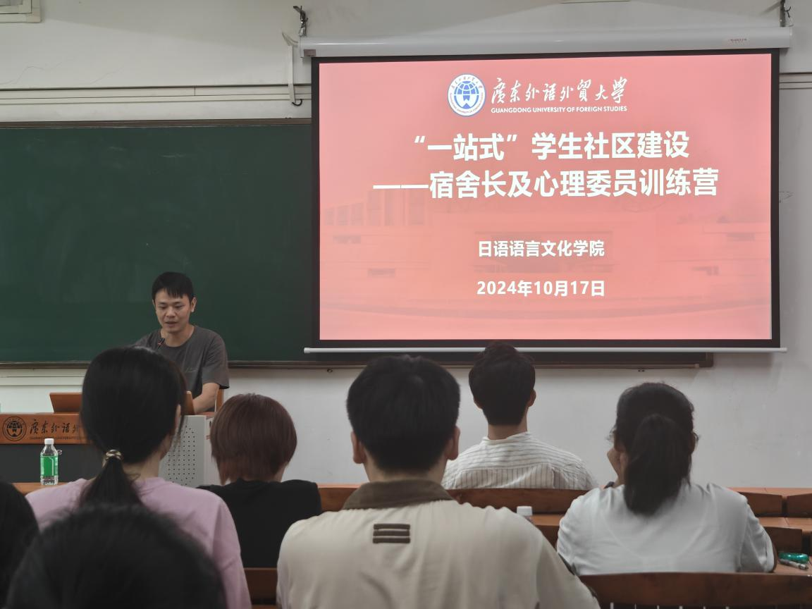 学工部李智聪老师为同学们讲述了学生社区建设与公寓文化创建。他通过学生社区概念、宿舍长的定位、集体生活法则和学生宿舍管理须知等方面向同学们全方位展示了独属于广外的宿舍文化。他表示,宿舍长作为宿舍信息的传递着、生活秩序的维护者、学习氛围的营造者、人际关系的协调者,不仅仅是同学们和学校老师沟通的纽带,更是维系学习与生活平衡的桥梁所在。