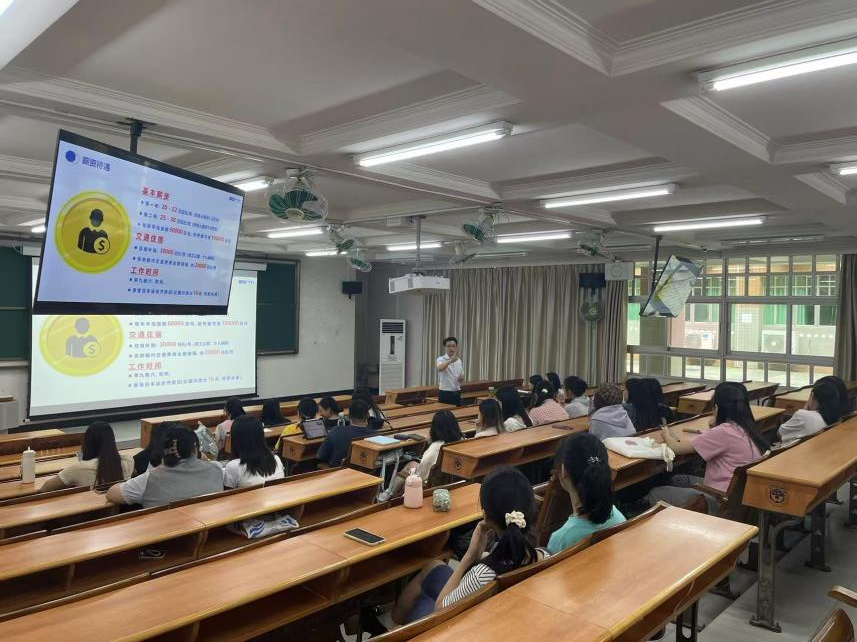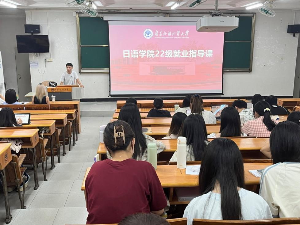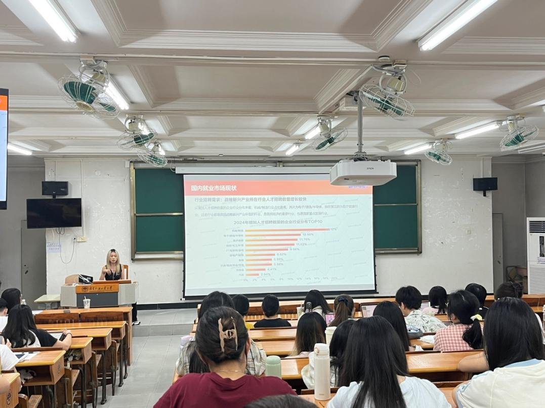 学院邀新东方留学部资深讲师张嘉雯担任主讲。她结合自身多年的面试官与职业规划经验,从“行业趋势分析”“职业定位与规划”“简历与面试技巧”以及“留学与就业选择”四大板块展开讲解。她指出,日语专业学生就业方向多元,可在外贸、教育、翻译、跨境电商等领域发展,同时鼓励学生结合个人兴趣与市场需求,制定个性化职业路径。